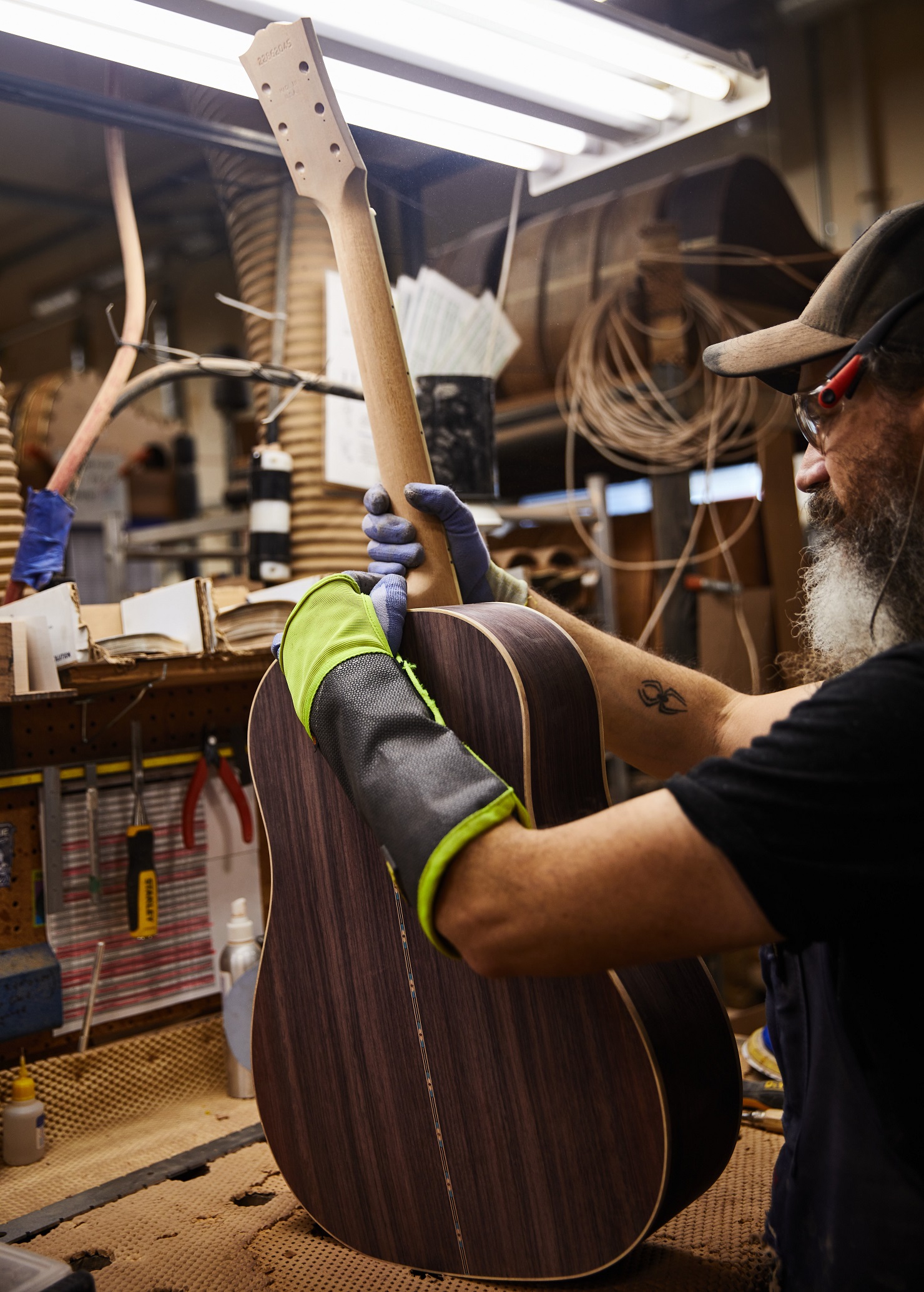 トラスロッドを入れたネックをボディに組み込みます。ギブソンアコースティックギターはボディとネックをニカワで接着(ダブテイル)することでサウンドが発揮されるのだそう。
