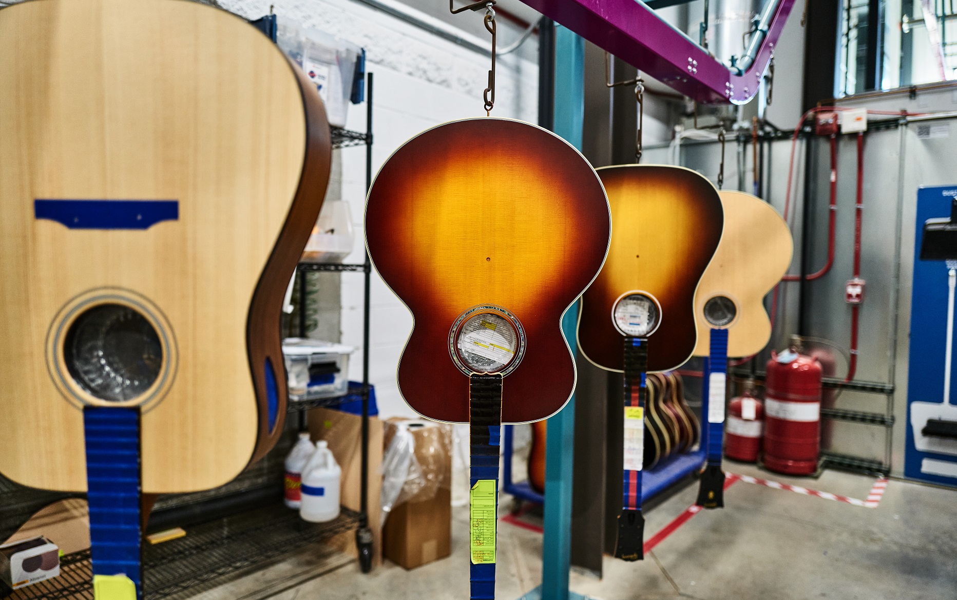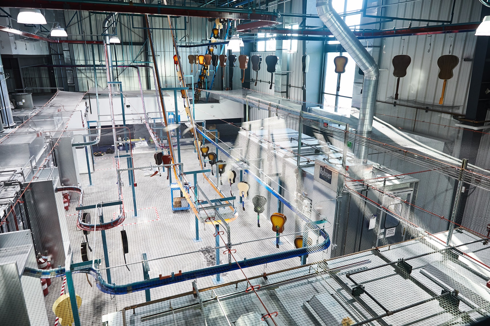 モンタナファクトリーの塗装ブースは2年前に改装され、生産効率が大幅にアップしています。広々とした空間にはレーンがひかれ、塗装されたギターがずらりと並びます。