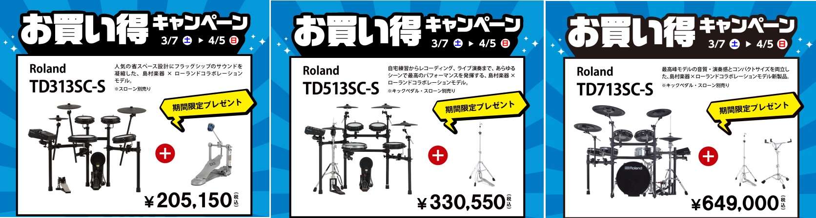 期間中、ローランドの電子ドラムセット「TD713SC-S」「TD513SC-S」「TD313SC-S」をお買い上げの方に通常別売りのハードウェア類(ペダル、スタンド類)をプレゼント。この機会にぜひご検討下さい。