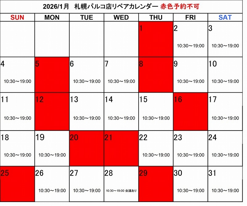 即日お渡しのクイックリペアやリペアマンと直接ご相談されたい場合は、リペアスタッフの稼動スケジュールをご確認頂き、事前にお問い合わせ下さい。