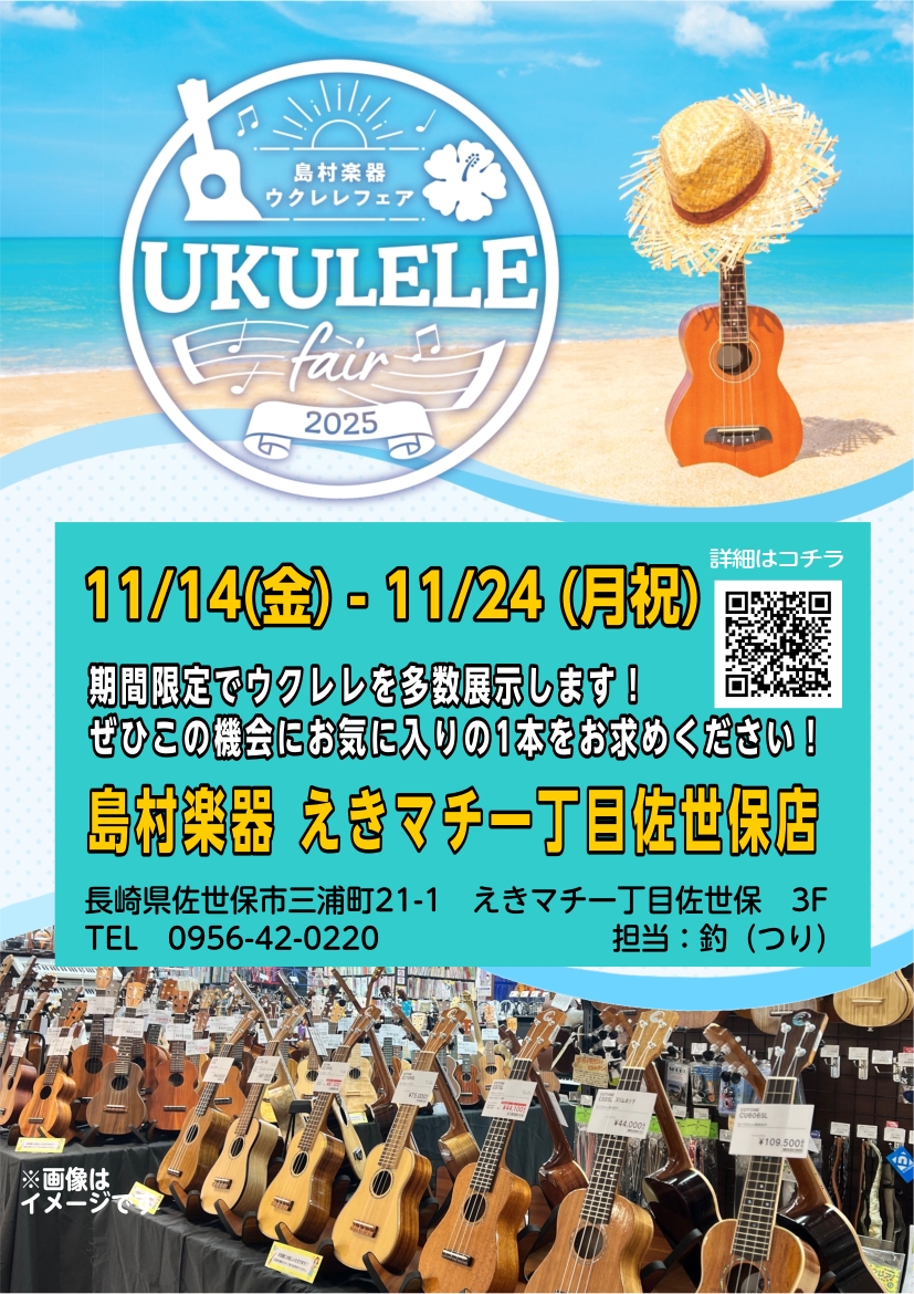 ![みなさま、こんにちは! えきマチ1丁目佐世保店ウクレレ担当をしている釣(つり)です。 少しずつ寒くなってきましたね。これから冬に向けてお家の中でほっこり楽しめる ウクレレを演奏しませんか?外は冬でもお家の中はウクレレの可愛い音色で南国気分。 ご好評いただいた夏のフェアに続き、再び開催です!! 普段店 […]](https://www.shimamura.co.jp/shop/sasebo/wp-content/uploads/sites/73/2025/11/20251106-20760bbc6e7c3fdac02c5f8c159dd129.jpg)