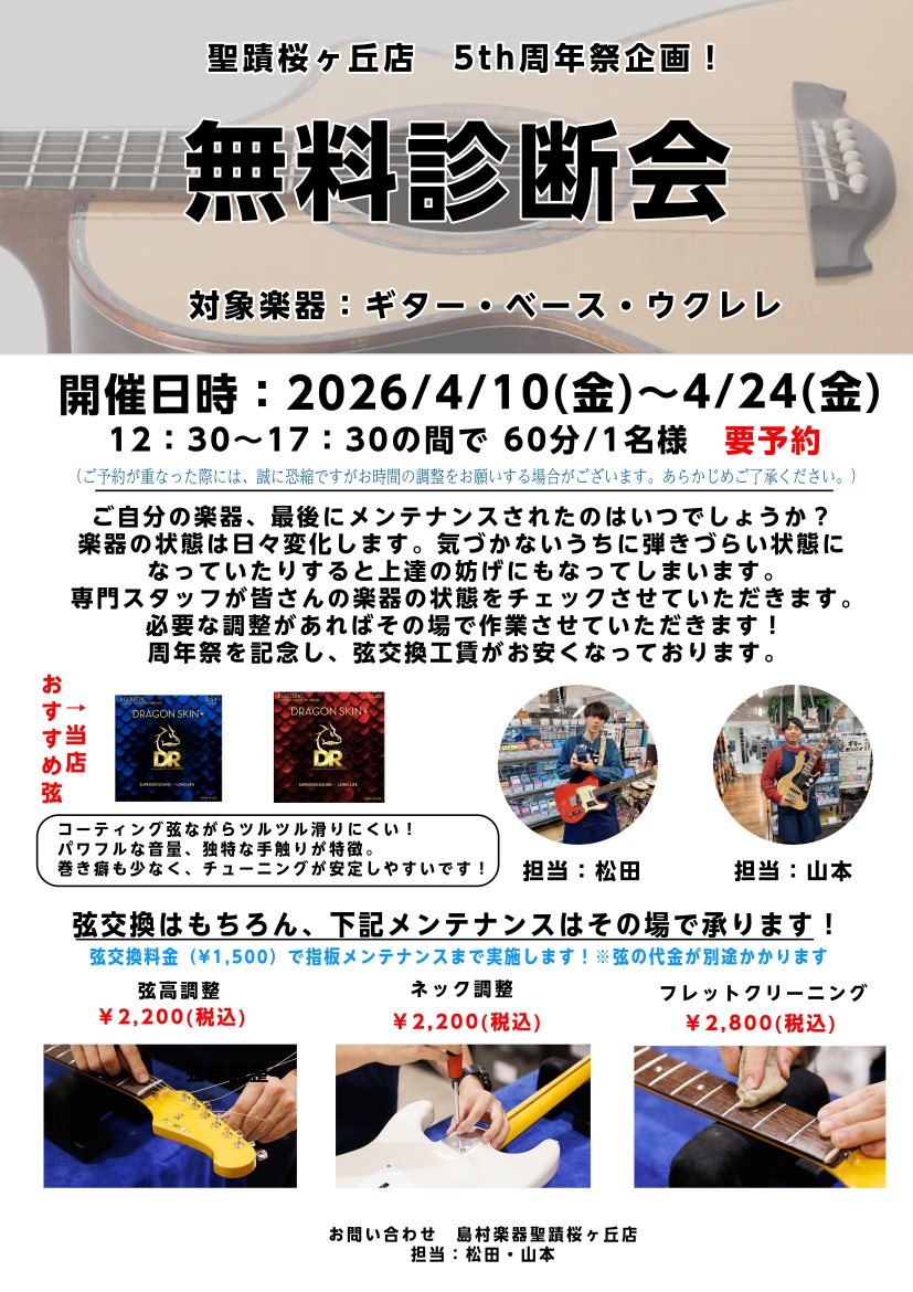 4/10(金)~4/24(金)の間、社内資格を持つスタッフよりお持ちの楽器の状態をチェックし、