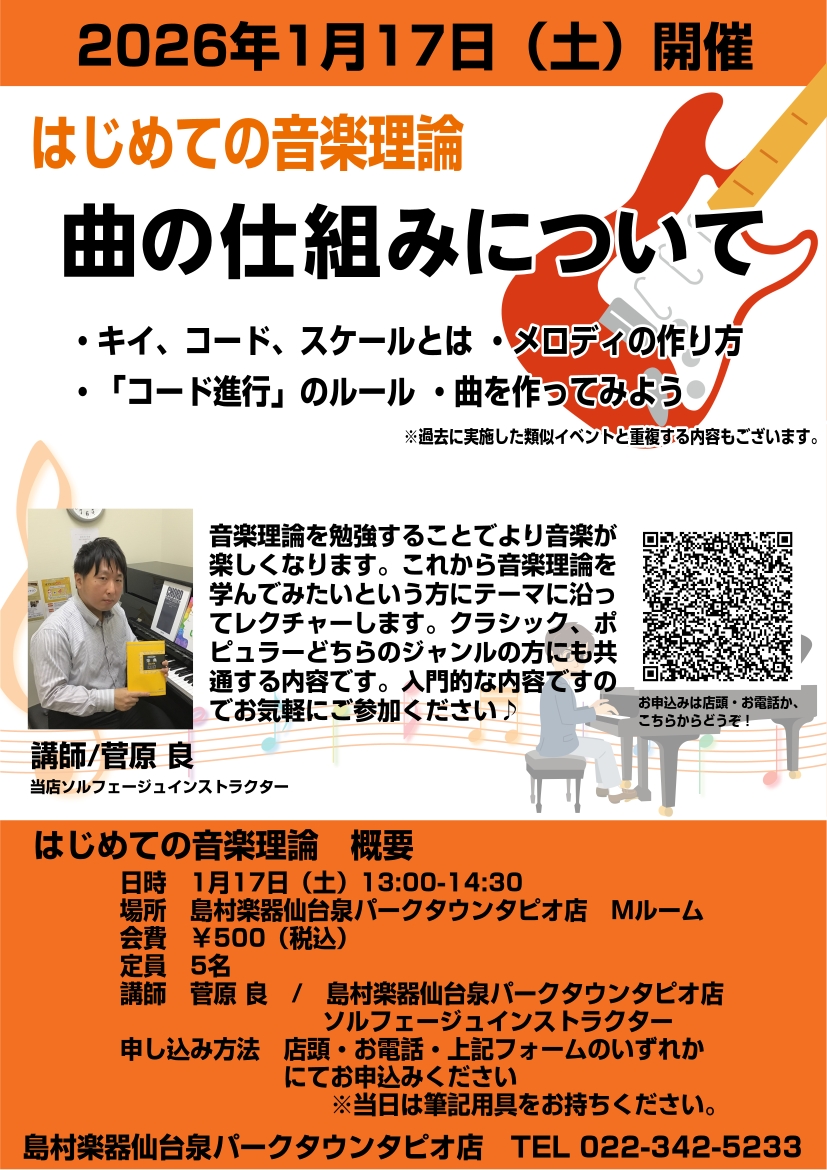 2026年1月17日(土) はじめての音楽理論「曲の仕組みについて」開催します!