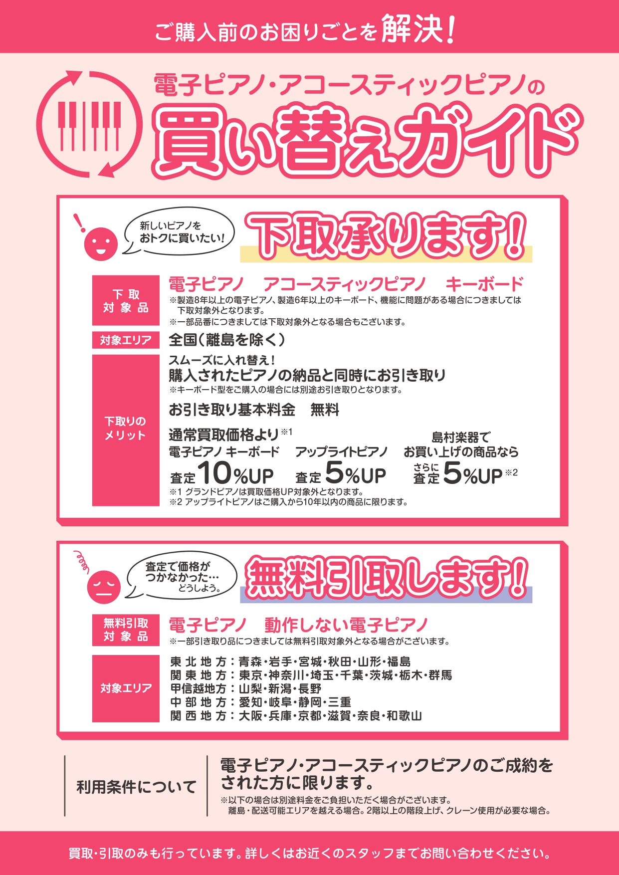 ピアノの買い替えをご検討中のお客様によく活用いただいている買取り&下取りのシステム。