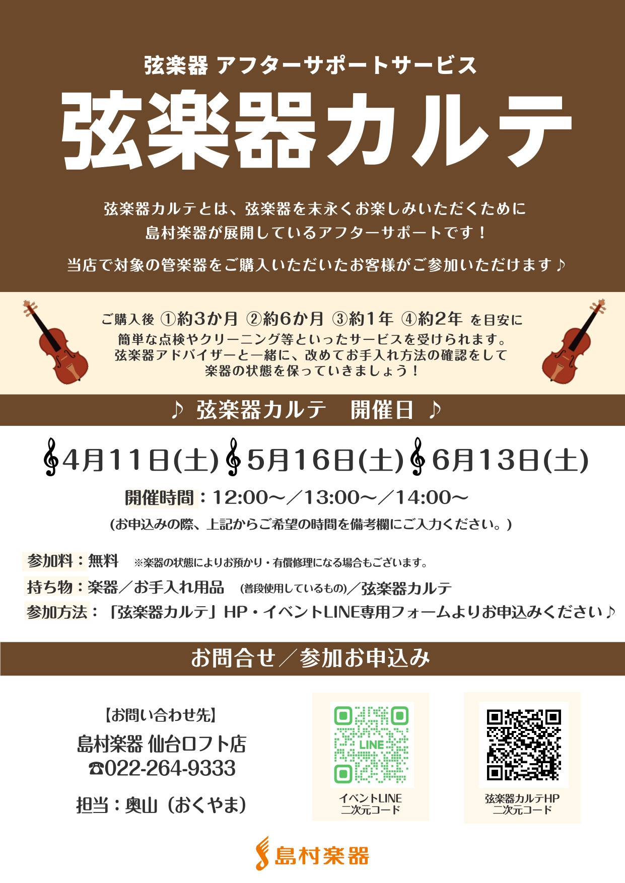![島村楽器仙台ロフト店では、当店でヴァイオリンをご購入いただいた方を対象に、「弦楽器カルテ」を行っております! 初めてのヴァイオリン、久しぶりのヴァイオリン、またまた2挺目、3挺目、、新たな音楽生活を歩まれるみなさまのアフターサポート、ぜひ島村楽器にお任せください! CONTENTS「弦楽器カルテ」と […]](https://www.shimamura.co.jp/shop/sendai/wp-content/uploads/sites/15/2025/10/20251026-20250908-c40381c748bbc0e69af986a7ac748138.jpg)