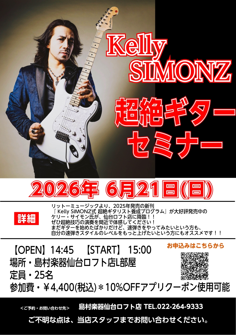 東北のギタリストの皆さん、「超絶シリーズ」でおなじみのKelly SIMONZ(ケリー・サイモン)氏の来仙が決まりました!!