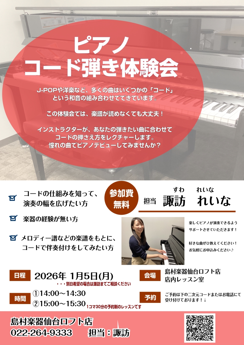 「ピアノサロン コード弾き体験会の申し込みです」とお伝えいただくとスムーズです。