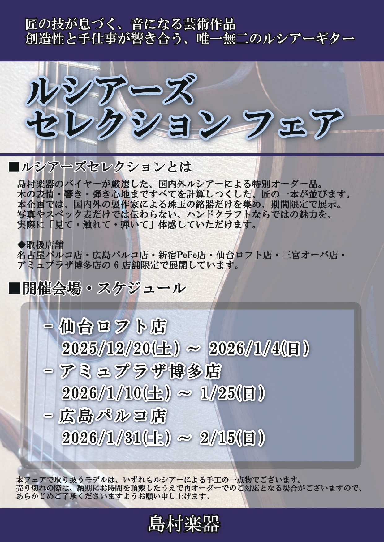 ![CONTENTS【12/20~ 1/4】“ルシアーズセレクションフェア”開催!現在お得なお支払い方法もご用意しております!展示ギターはこちら!12/20(土)・21(日)限定!専門スタッフが特別にご案内可能!ご来店・ご試奏予約はこちら♪もちろんルシアーズ・セレクション以外のアコースティックギターも充 […]](https://www.shimamura.co.jp/shop/sendai/wp-content/uploads/sites/15/2025/12/20251216-img_0097-e1765782469178.jpg)