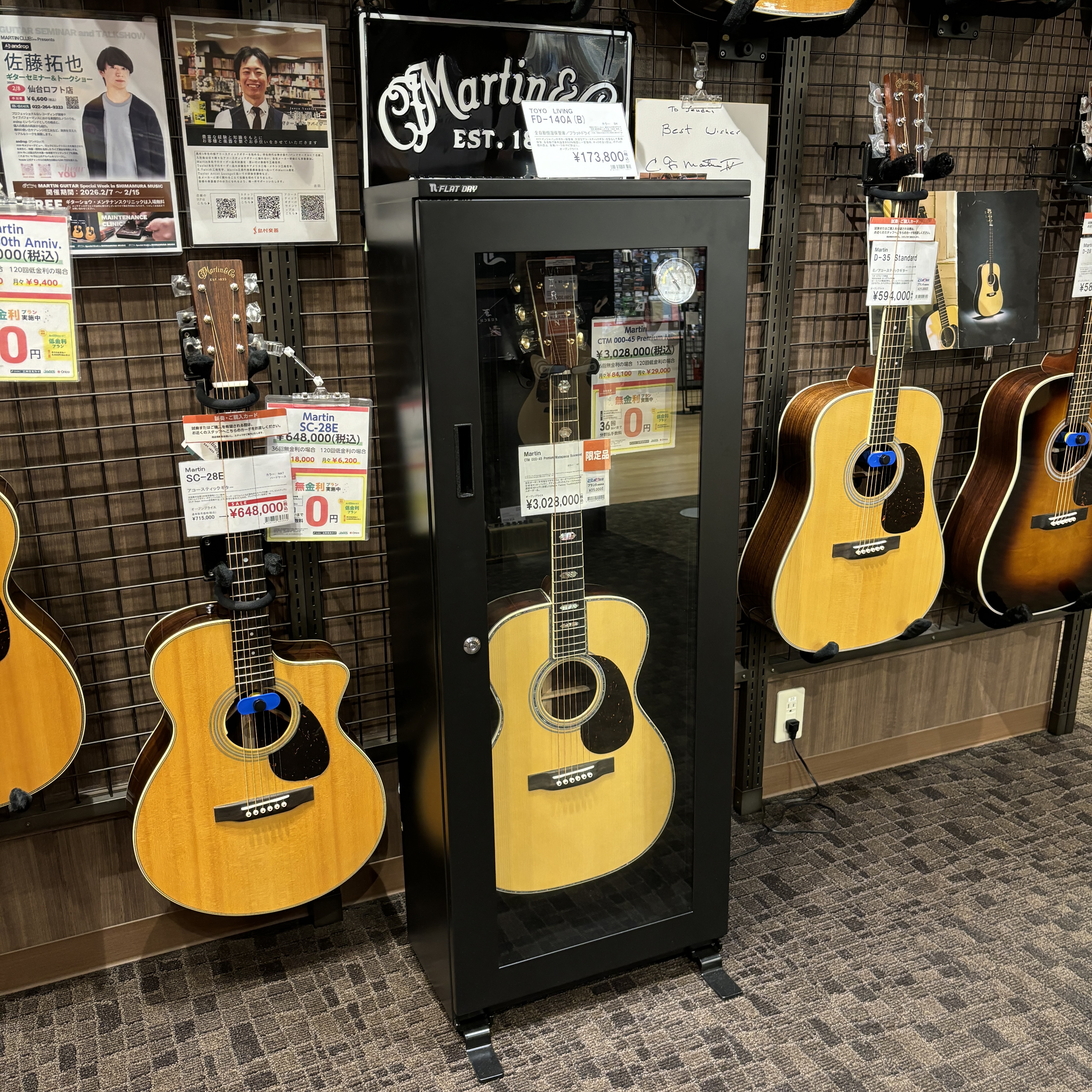 また、“高額ギターを検討しているけれど、湿度管理が不安…”という方向けに、フラットドライ(湿度調整機能付きギター保管庫)も展示。当店の高額ギターを守ることはもちろん、お客様の目でその効果を実際にご確認いただけます。