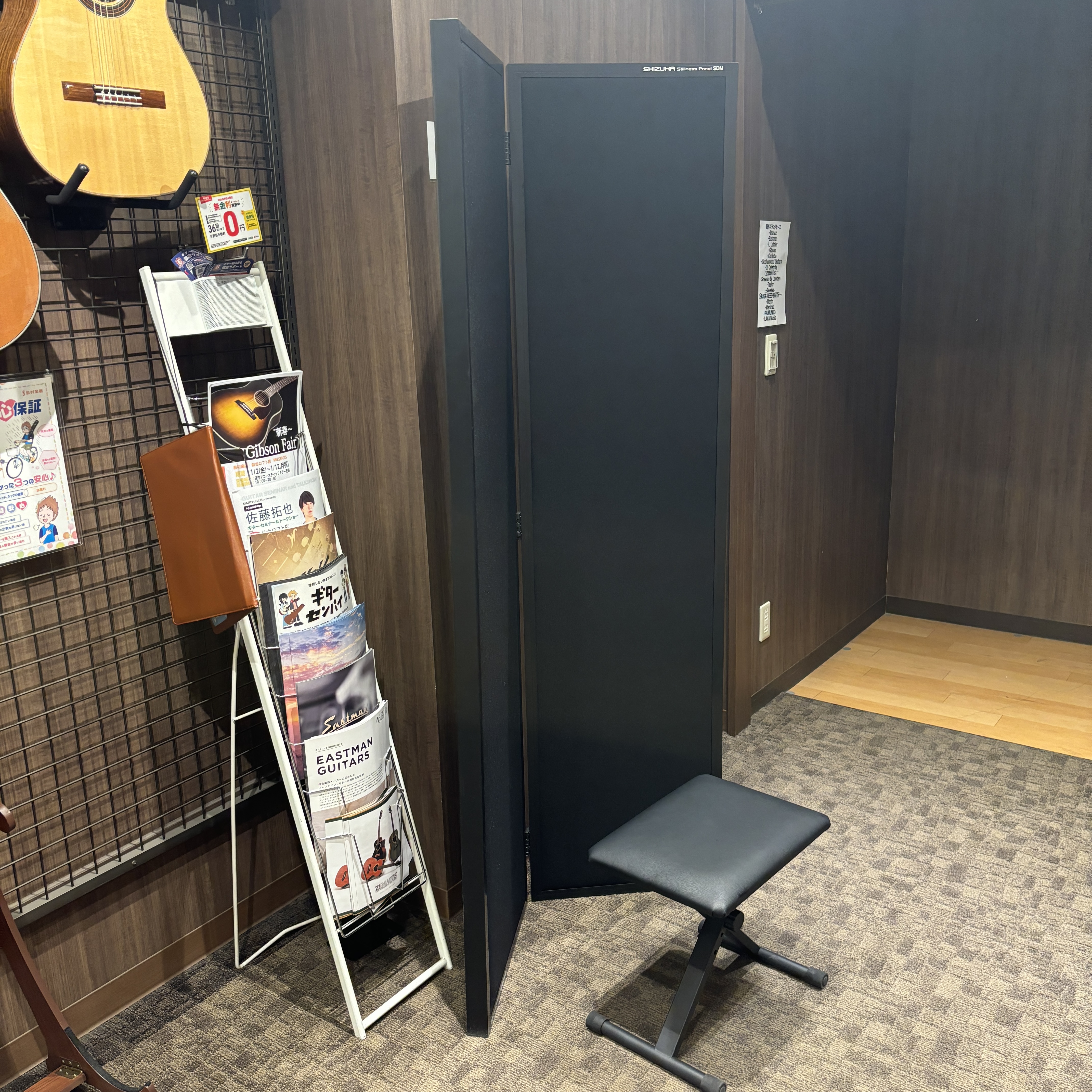 試奏スペースには“調音パネル”も常時スタンバイ。“試奏したいけれど、周りの目が気になる…”という方や、“周りの音が気になるので、静かな環境で試奏したい”という方も安心してご試奏いただけます。