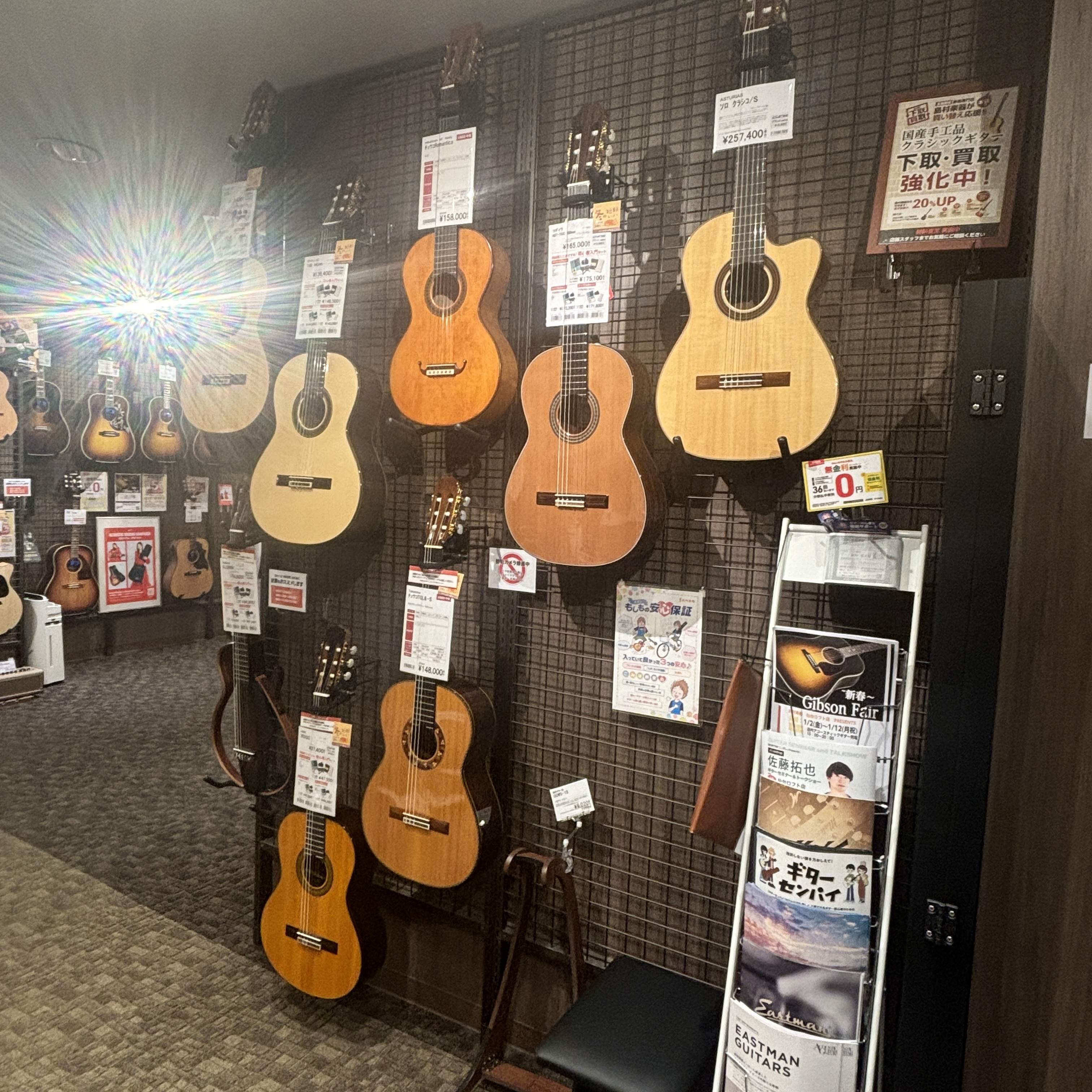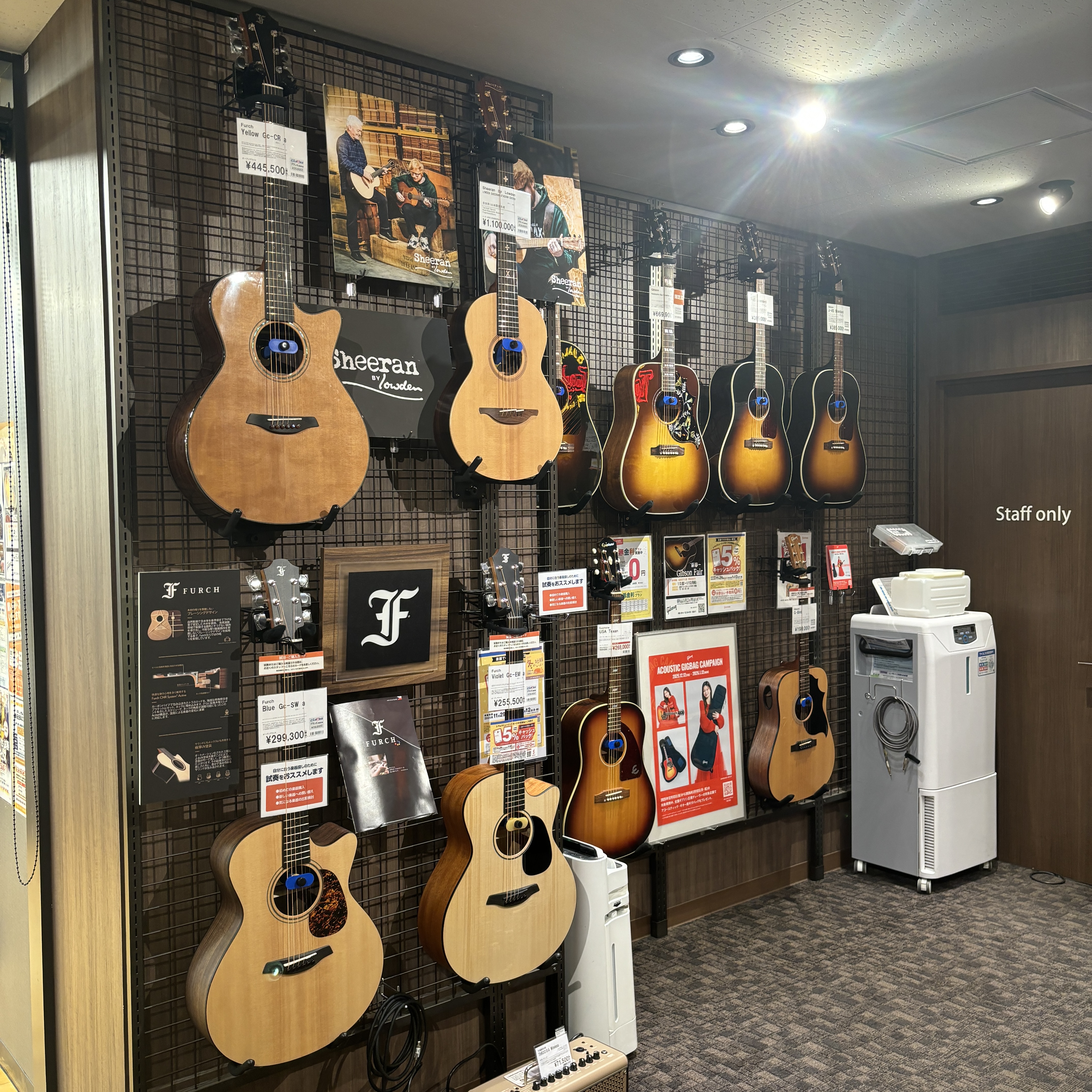 当店では、アコースティックギター担当吉田(よしだ)をはじめとする、専門性の高いスタッフが厳選したアコースティックギターを多数展示しております。