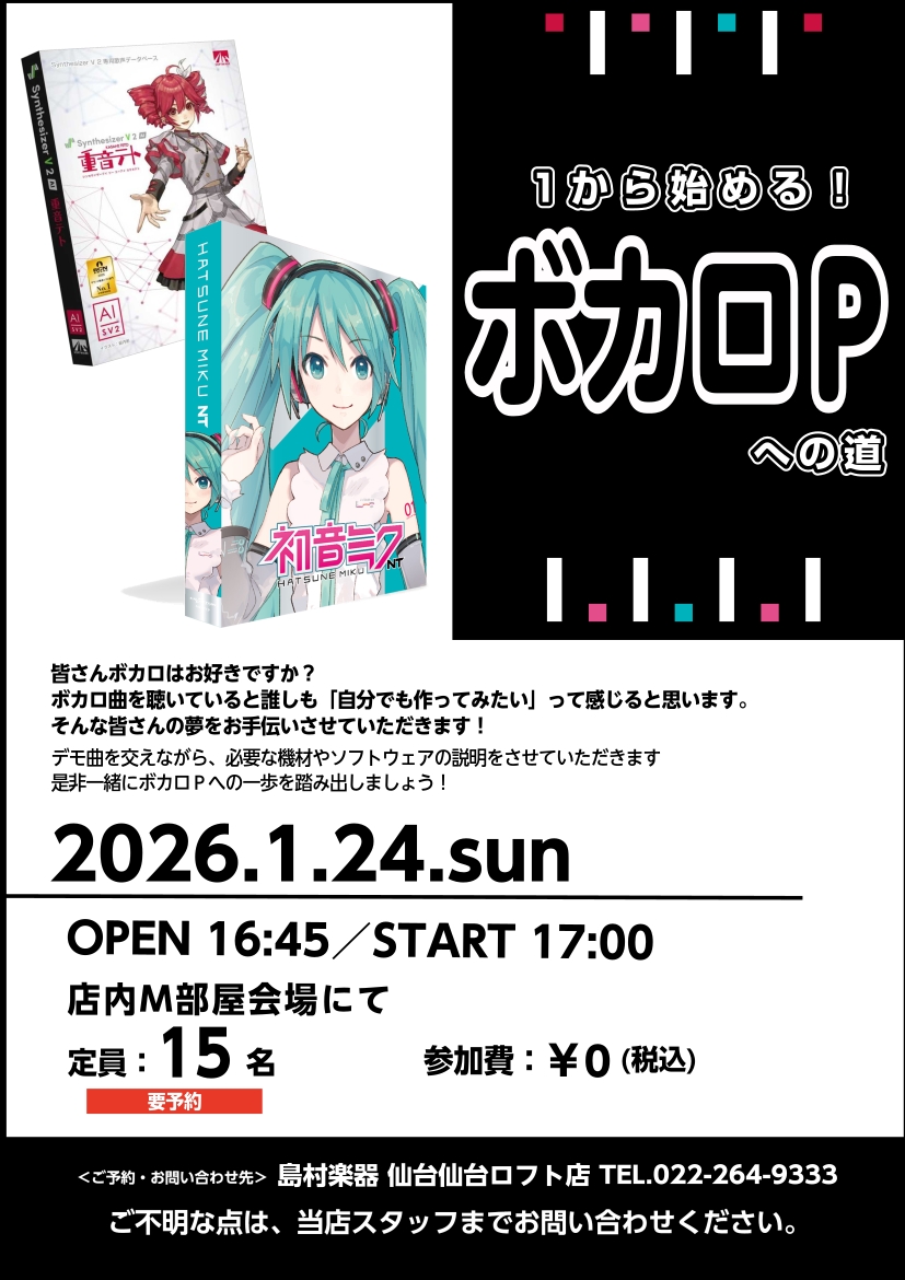 ![こんにちは!島村楽器仙台ロフト店の佐藤です!皆さん普段からボカロ曲は聴いていますか?歴史が長くなってきたボカロ文化ですが、進化しながら盛り上がり続けています。そんな中いい曲を聴くたびに思いませんか?「好きなキャラクターに歌ってもらいながら自分でも曲を作ってみたいな」実は作曲を始めることは難しくありま […]](https://www.shimamura.co.jp/shop/sendai/wp-content/uploads/sites/15/2025/12/20251220-shima251219-0213-1.jpg)