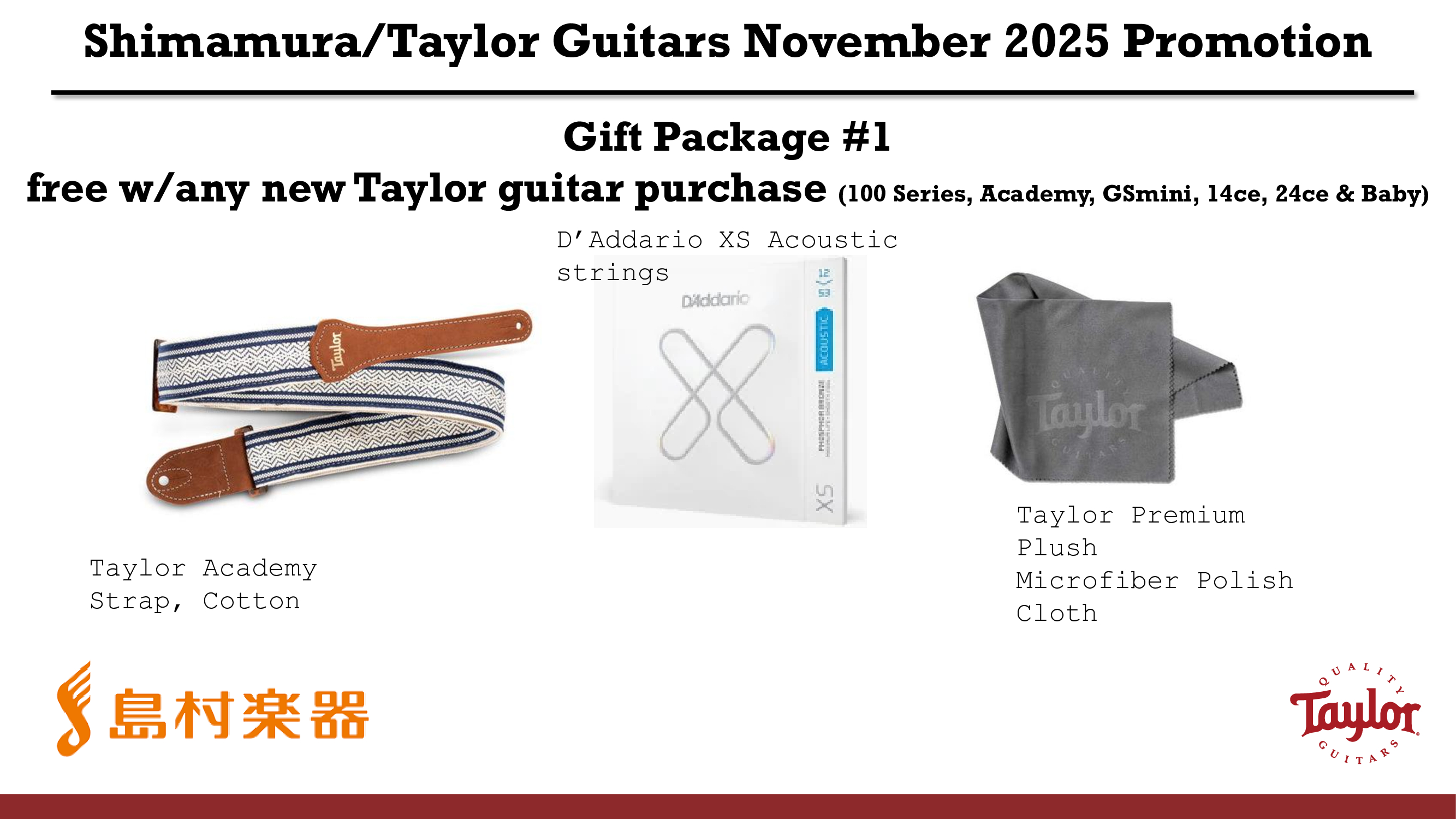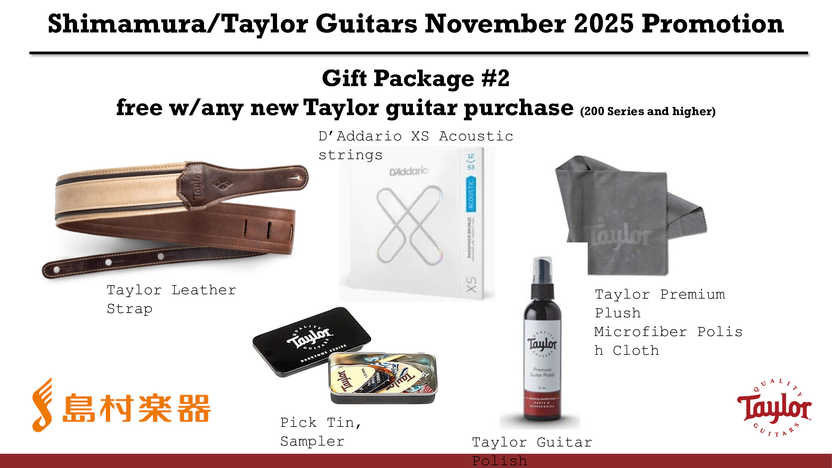 数量限定の早いもの勝ちではございますが、期間中Taylorギターをご購入の方へ、シリーズに応じて以下のプレゼントを差し上げます♪