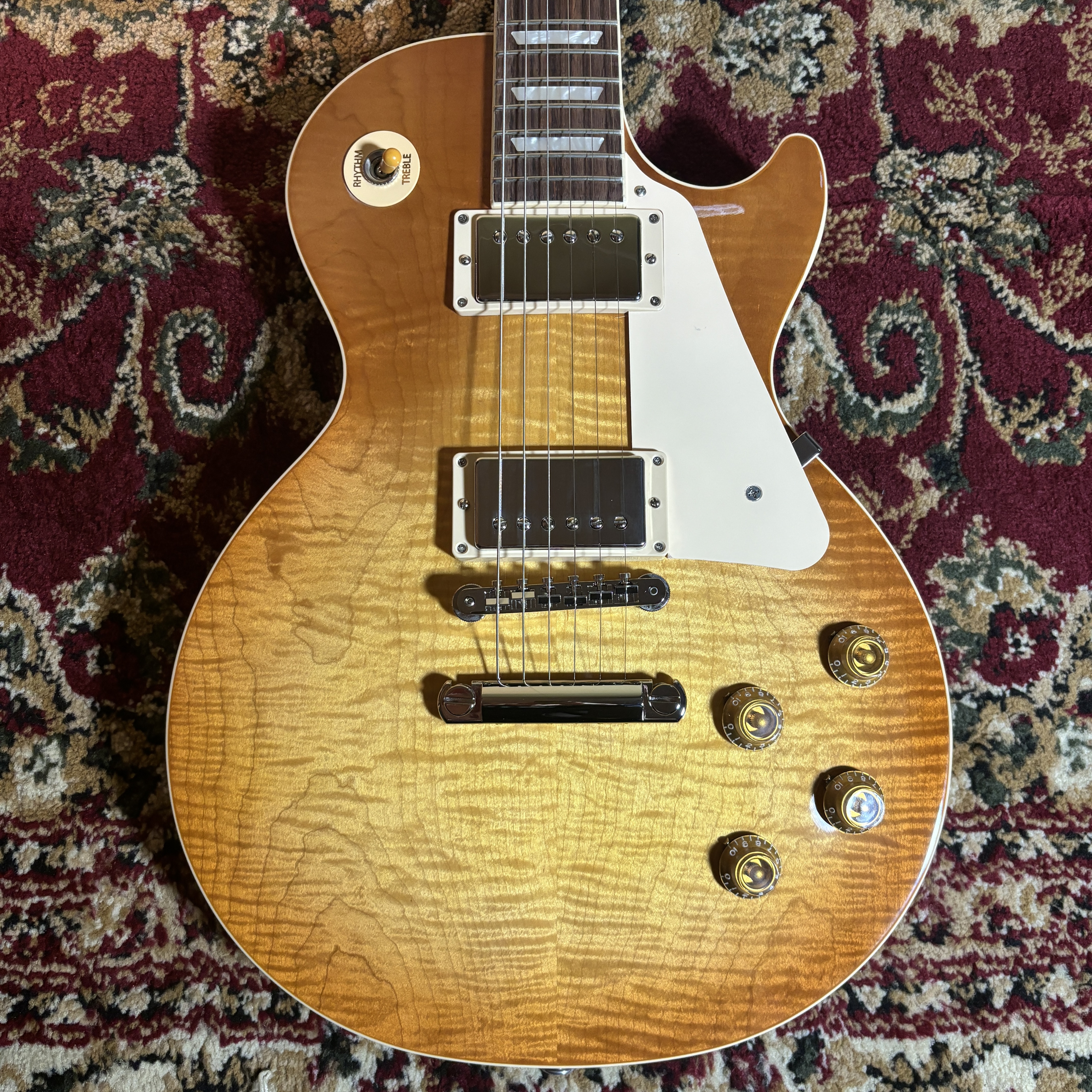 日本限定モデル(Japan Exclusive)として、ボディトップにCustom Shopグレードのメイプル材を贅沢に使用した1本。カラーは人気のUnburstを採用し、派手すぎず気品のある杢目が際立ちます。中身は王道の50sスペック。手に馴染む太めのネックグリップと、豊かな鳴りが魅力です。