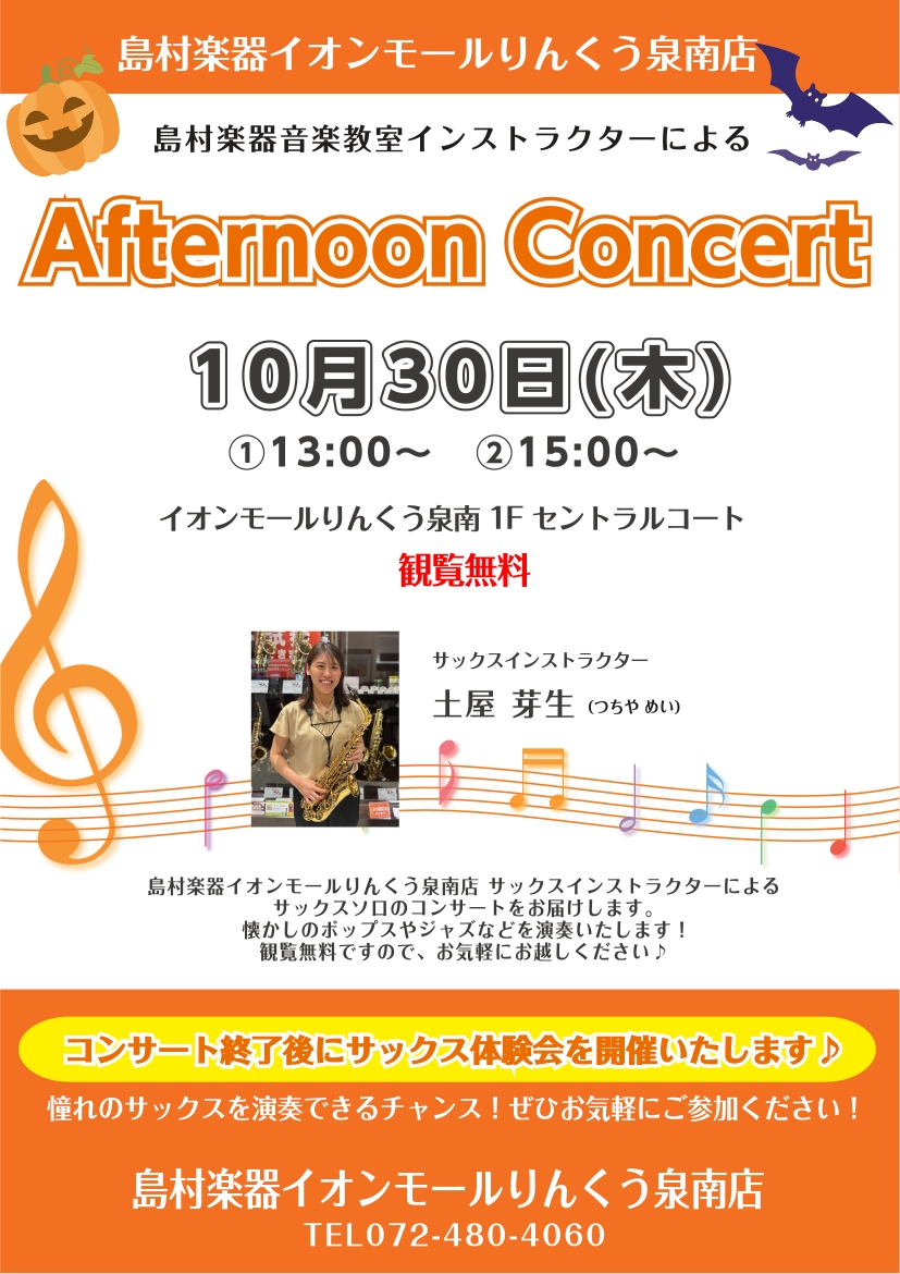 ![CONTENTSAfternoon Concertとは?コンサート詳細出演者紹介楽器体験会も開催いたします!Afternoon Concertの様子お問い合わせAfternoon Concertとは? 「Afternoon Concert」とは、島村楽器イオンモールりんくう泉南店音楽教室のインストラ […]](https://www.shimamura.co.jp/shop/sennan/wp-content/uploads/sites/60/2025/09/20250928-30e3de51d8f2161cde1f8f1538692545.jpg)