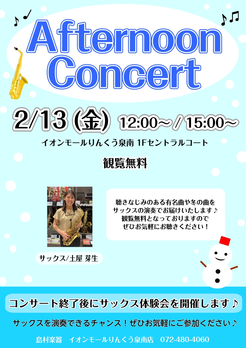 【泉南イオン】2月13日(金)Afternoon Concertを開催いたします!【サックス🎷】
