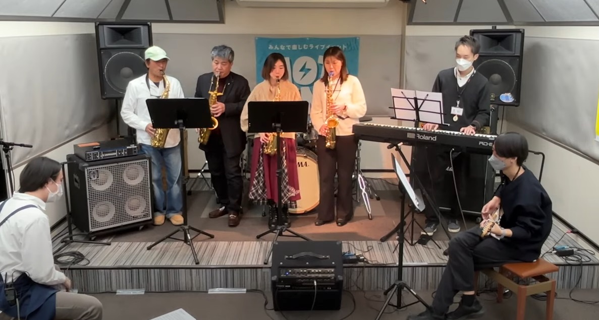 泉南店のサックスインストラクターを先導に「上を向いて歩こう」を演奏!