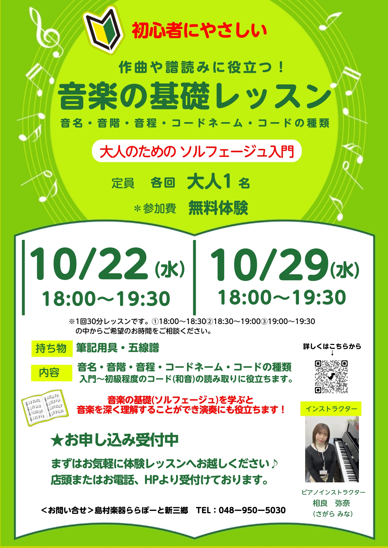 ![CONTENTSソルフェージュってなに?こんな方におススメ!ソルフェージュの授業の内容は?体験会♪担当インストラクター紹介開講曜日・時間レッスン料金コース概要体験レッスンお申込み・お問い合わせソルフェージュってなに? ソルフェージュとは 音楽を表現するうえで必要不可欠な、「楽譜の理解」を中心とした『 […]](https://www.shimamura.co.jp/shop/shinmisato/wp-content/uploads/sites/179/2023/12/20231227-photo-output-1.jpg)