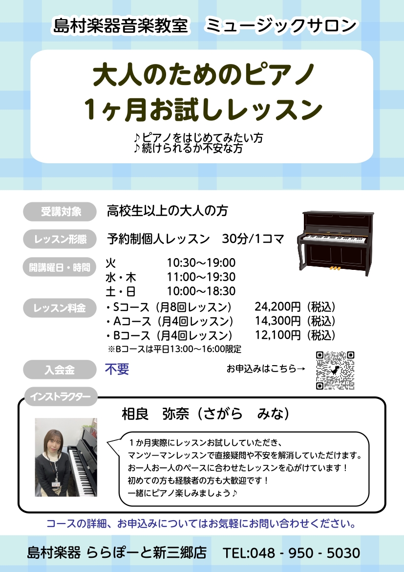 ![こんにちは♪島村楽器ららぽーと新三郷店ピアノインストラクターの相良です! ピアノ弾いてみたいけど、難しそう…と諦めてしまっている方も多いのではないでしょうか。短期間集中で、1曲弾けるようにチャレンジしてみませんか?1ヶ月お試しレッスンですのでお気軽にお越しください♪ CONTENTSピアノサロン イ […]](https://www.shimamura.co.jp/shop/shinmisato/wp-content/uploads/sites/179/2025/12/20251211-shima251211-0115-1.jpg)
