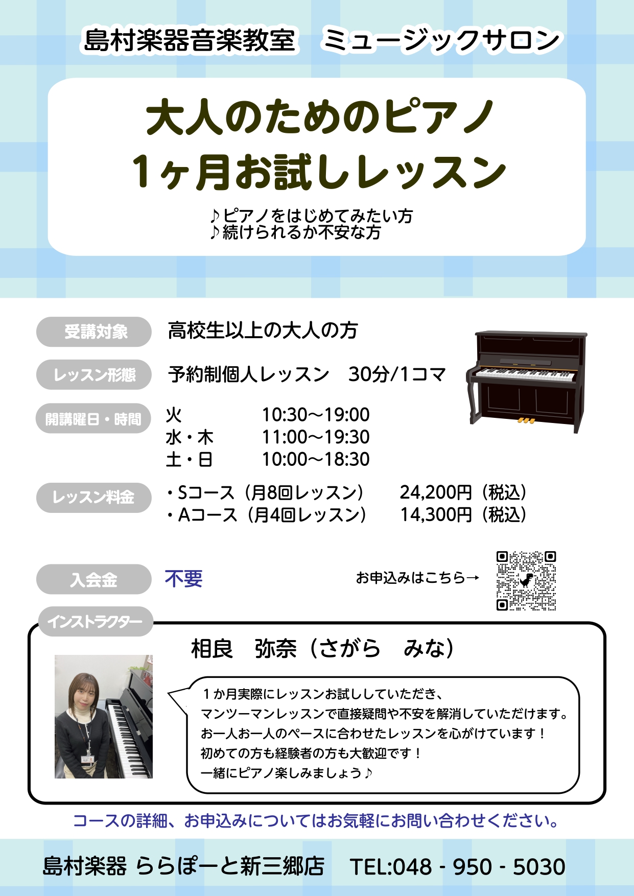 ![こんにちは♪島村楽器ららぽーと新三郷店ピアノインストラクターの相良です! ピアノ弾いてみたいけど、難しそう…と諦めてしまっている方も多いのではないでしょうか。短期間集中で、1曲弾けるようにチャレンジしてみませんか?1ヶ月お試しレッスンですのでお気軽にお越しください♪ CONTENTSピアノサロン イ […]](https://www.shimamura.co.jp/shop/shinmisato/wp-content/uploads/sites/179/2025/12/20251211-shima251211-0115-1.jpg)