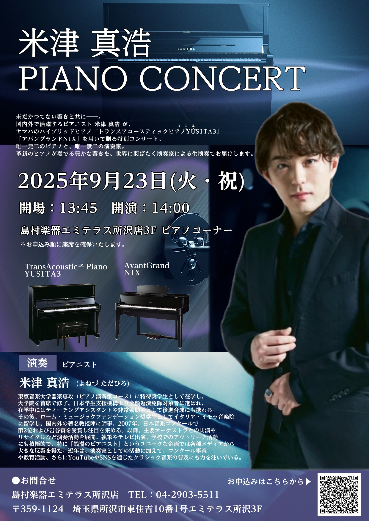2025年9月23日(火・祝)は、島村楽器エミテラス所沢店へ!! このたび、国際的に活躍するピアニスト 米津真浩(よねづ ただひろ) さんをお迎えし、ヤマハ最新モデル「トランスアコースティックピアノ YUS1TA3」と「アバングランド N1X」を使用した特別コンサートを開催いたします。 "響板スピー […]