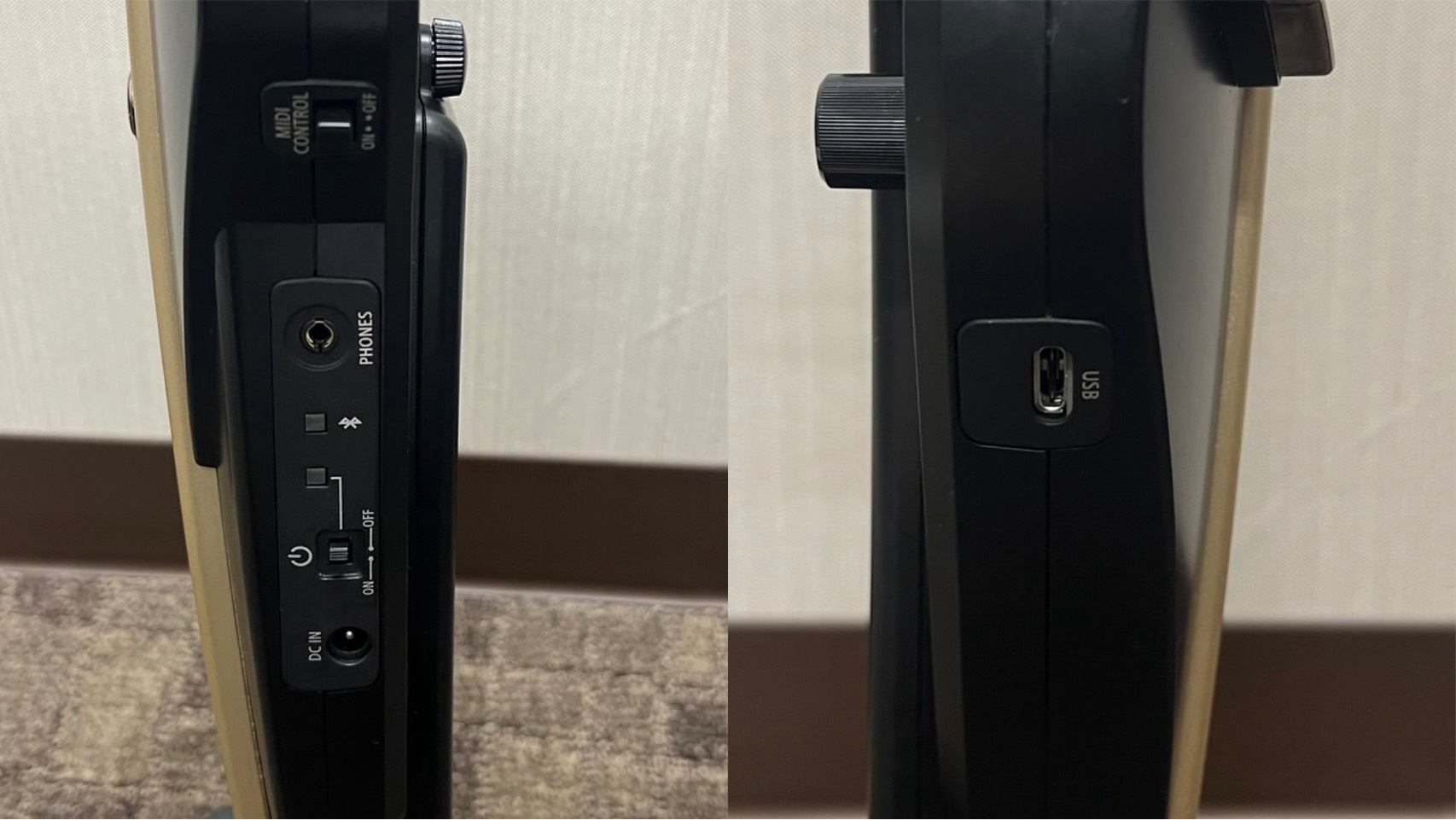 【右】 USB端子 本体とパソコンを付属のUSBケーブルで接続して、パソコン上のDAW等のソフトウェアに演奏をオーディオ録音や