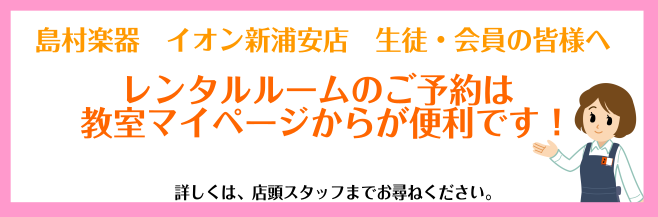 ![防音完備!!雨にぬれずに駅徒歩2分!イオン新浦安3階にございます CONTENTS音楽教室レッスン室レンタル(練習室のお貸出し)のご案内レンタル料金レンタル規定レッスンルーム・常設備品のご紹介曜日別予約開始日 一覧よくあるご質問ご予約方法・お問い合わせご予約の変更・キャンセルアクセス音楽教室レッスン […]](https://www.shimamura.co.jp/shop/shinurayasu/wp-content/uploads/sites/35/2025/12/20251211-20210721-image3-41.jpg)