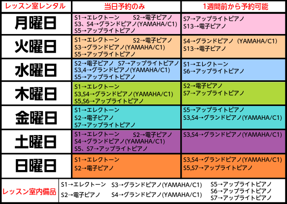| 部屋名称 (電子ピアノ) | S1,S2,S6,S13 |
