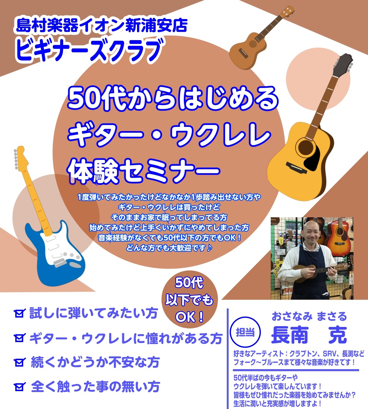 初心者さん向けビギナーズクラブ【50代から始める ギター体験セミナー🎸】定期開催中!