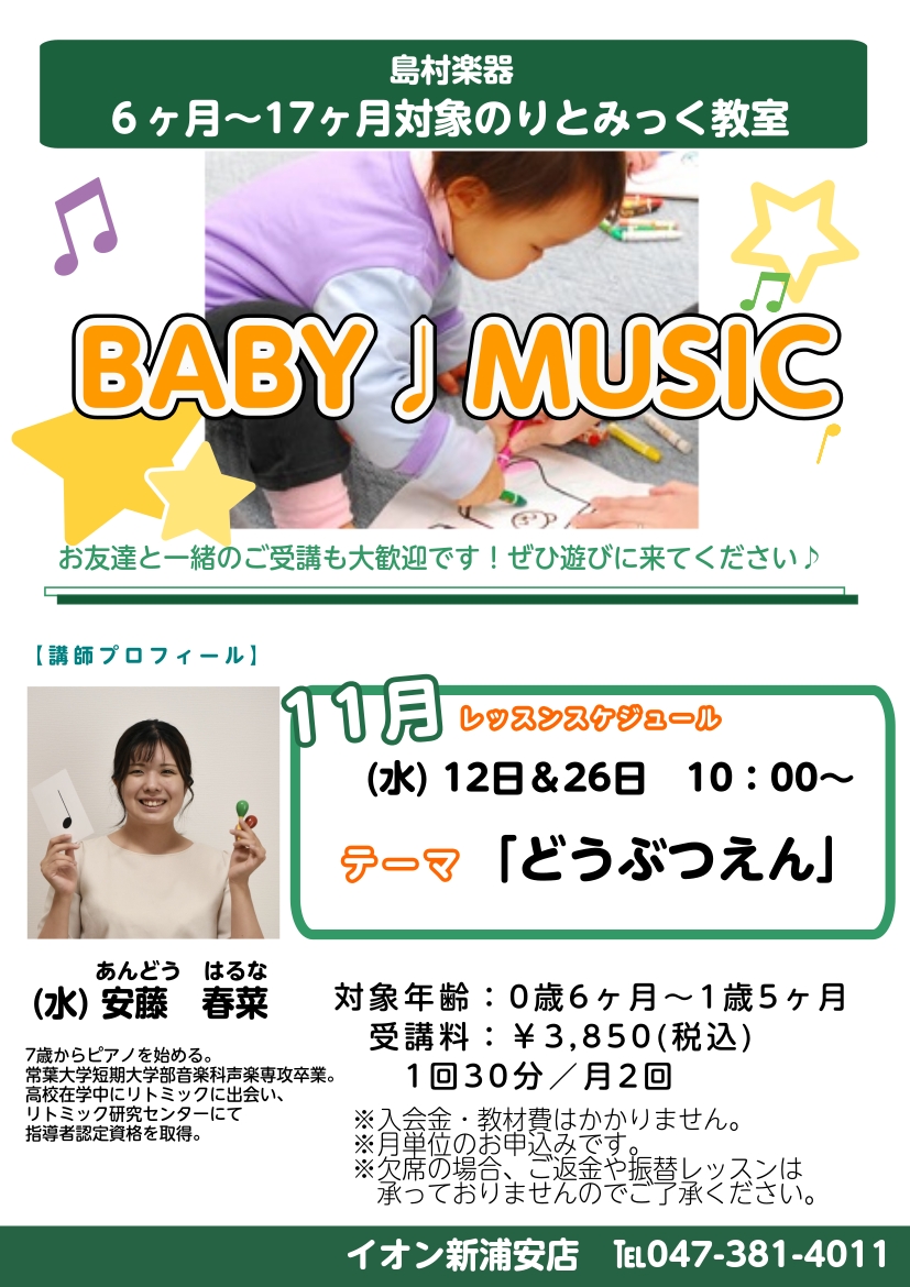 ![CONTENTS親子で楽しく音楽にふれられる「BABY MUSIC」イベント概要親子で楽しく音楽にふれられる「BABY MUSIC」 0歳から始められる季節のテーマに沿った「リズム遊び」や「歌遊び」で、保護者の方と一緒にお子さまの成長をサポートします。親子での「はじめての音楽体験」にピッタリです。ぜ […]](https://www.shimamura.co.jp/shop/shinurayasu/wp-content/uploads/sites/35/2025/08/20250819-20171008-20170608-tmp-rythmique-hiroba-1.jpg)