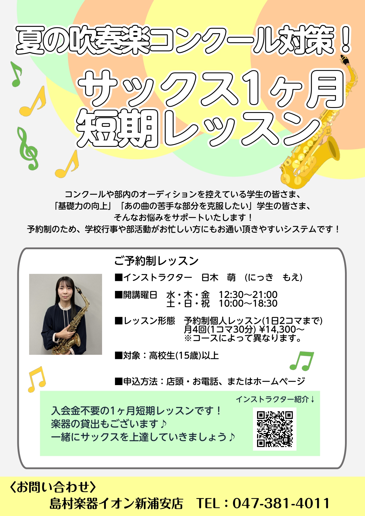 | 担当 | サックスインストラクター 日木(にっき) |