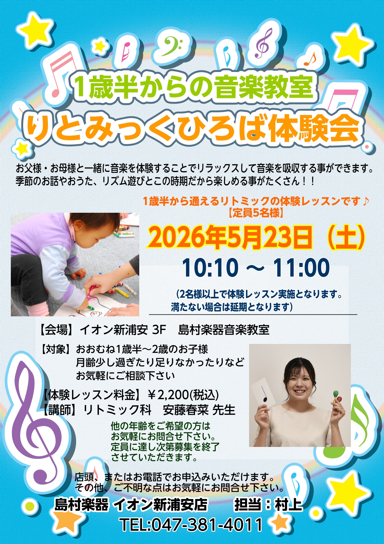 \6月スタート!/ 1歳半からの親子リトミック「りとみっくひろば」体験会開催【5/23(土)10:10~】 イオン新浦安店