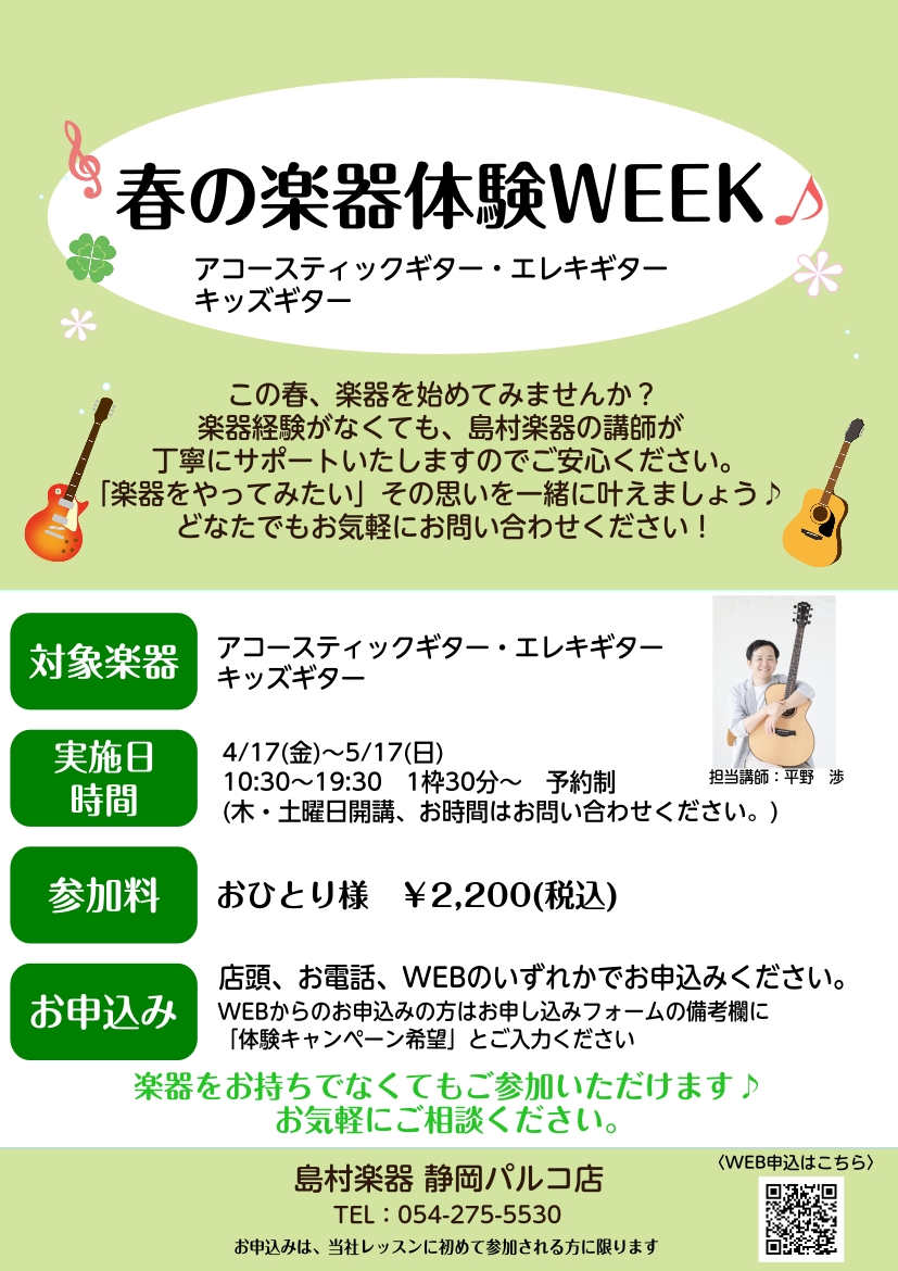 【静岡パルコ店】初心者さん大歓迎!「春の楽器体験WEEK」で憧れのギターデビューしませんか?