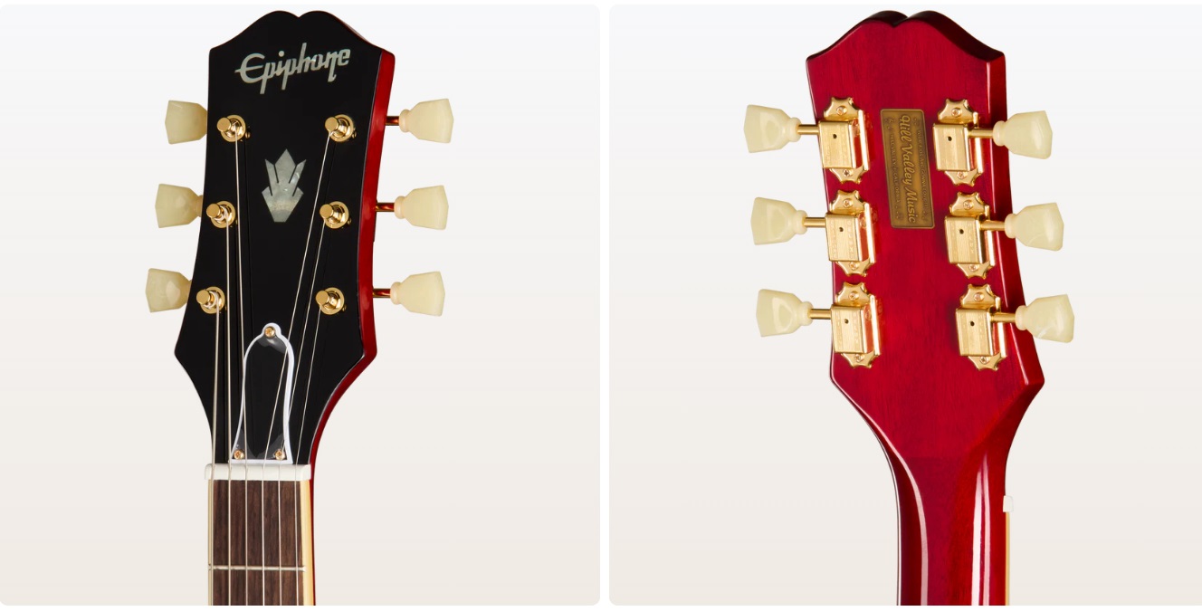 60年代カラマズー・スタイルのヘッドストックには、Graph Tech®ナットとクリーム色のキーストンボタン付きEpiphone Deluxeチューナーを搭載。ヘッド正面にはマザー・オブ・パールのEpiphoneロゴとGibsonクラウン・インレイが施され、裏面には映画にちなんだ「Hill Valley Music」ストアのデカールが貼られています。