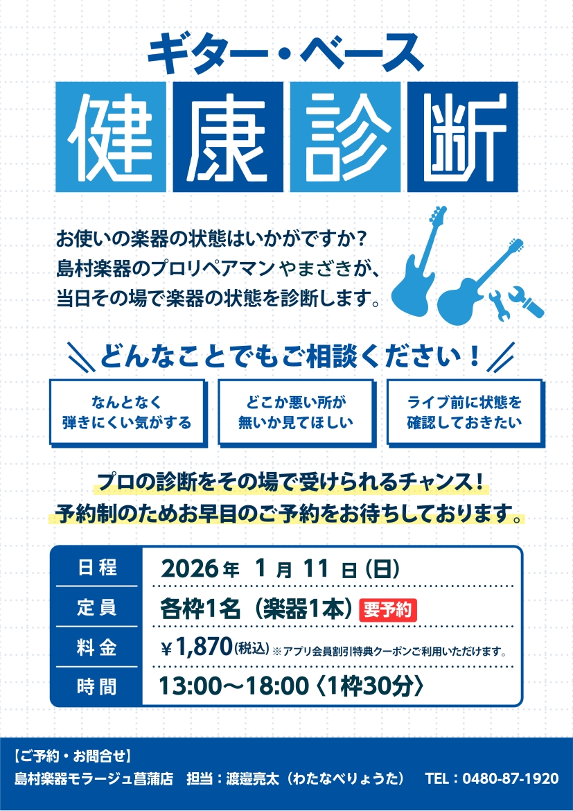 【予約制】2026年1月11日(日)ギター・ベース健康診断開催します