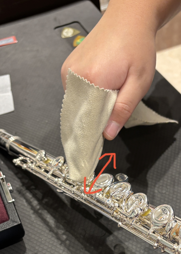 キィについている指紋を拭く時は、写真のようにキィの生えている向き(下の写真2枚目、⇔の方向)に沿って拭くと、キィが曲がりづらいです。また、キィの近くの管体を拭く時は、タンポの縁にクロスがこすれないようにお気を付けください。