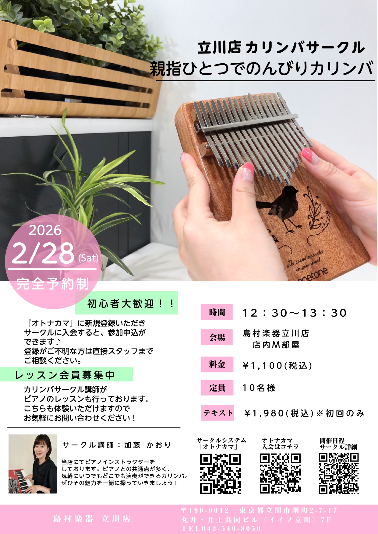 CONTENTS立川カリンバサークルとはイベント詳細立川カリンバサークルのお申込みはこちら!立川カリンバサークル インストラクター紹介お問い合わせ立川カリンバサークルとは 立川カリンバサークルは、カリンバのやさしい音色を通して音楽を楽しむ時間を共有するサークルです。 カリンバが初めての方も、音を奏で […]