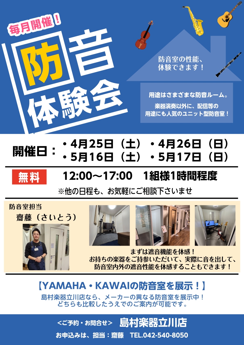 ![島村楽器立川店では、防音室の体験ができるイベントを定期開催しております。導入を検討中の方はもちろん、情報収集だけでも大歓迎ですので、是非ご参加ください♪ CONTENTS防音体験会を開催!詳細防音体験会のご予約方法担当スタッフ:齋藤防音体験会を開催! 当店では、ヤマハとカワイの防音室を展示しておりま […]](https://www.shimamura.co.jp/shop/tachikawa/wp-content/uploads/sites/194/2026/02/20260409-shima260409-0143-1.jpg)