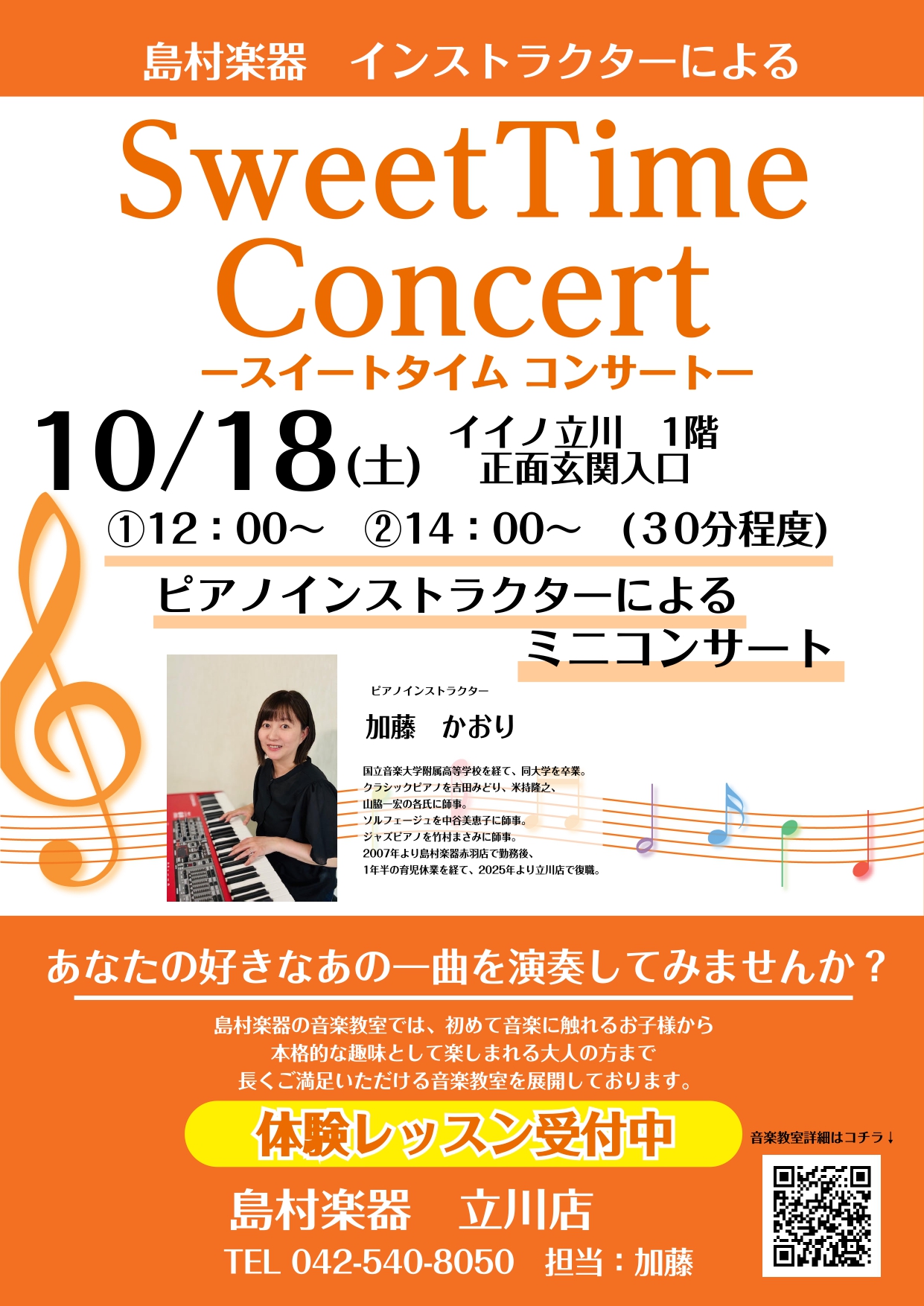 ![皆様こんにちは、島村楽器立川店ピアノインストラクターの加藤です。10月18日(土)12:00~/14:00~ の2回、イイノ立川 1階 正面玄関入口 にて「Sweet Time Concert」を開催いたします。(※各回30分程度を予定しています) どこかで聴いたことのある名曲を中心に、皆さまにお楽 […]](https://www.shimamura.co.jp/shop/tachikawa/wp-content/uploads/sites/194/2025/05/20250528-8ca5e733757be7d017b9a246cdc82c79.jpg)