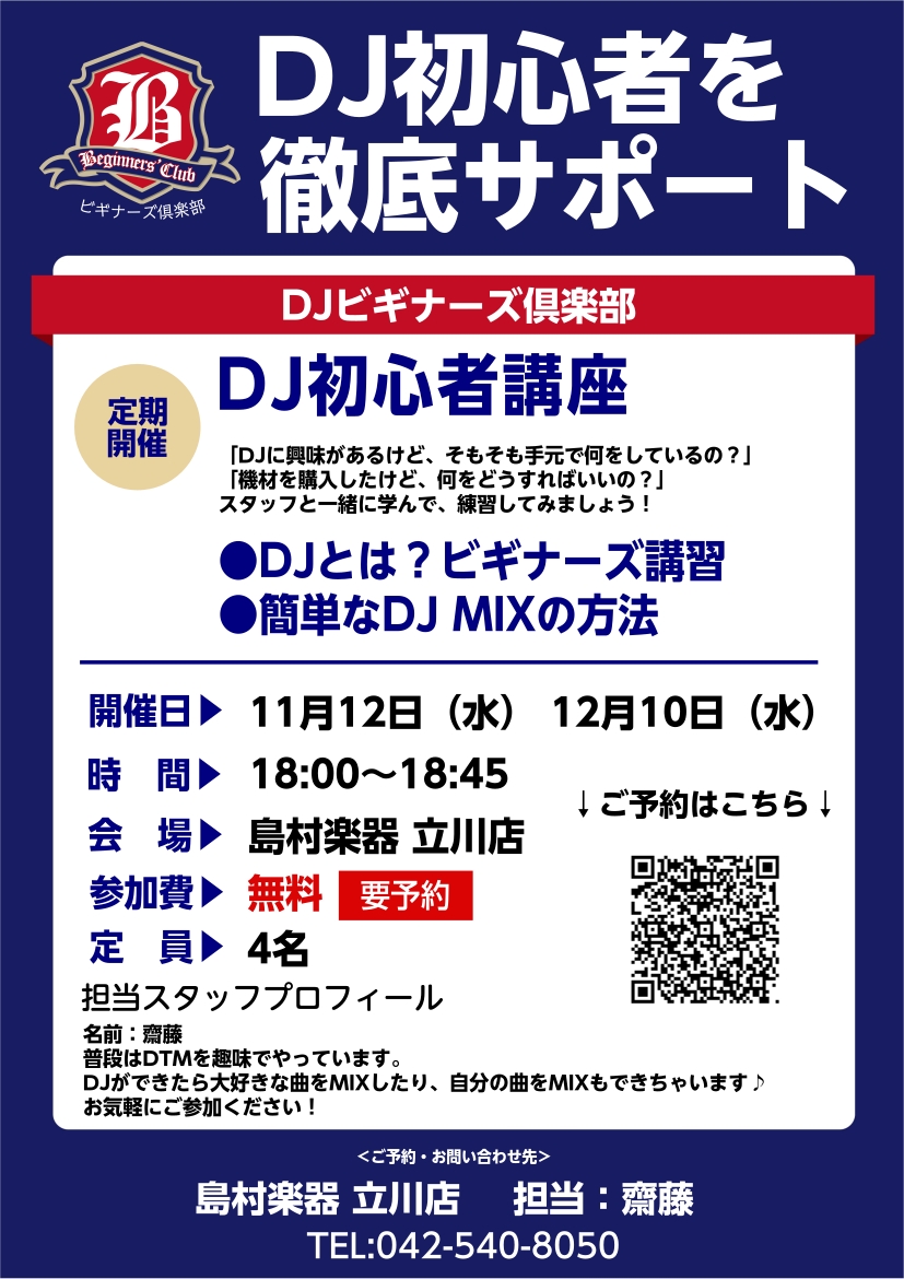 ![DJ初心者大歓迎!DJが何をやっているのか?DJを楽しむためのサポートはお任せ下さい! DJビギナーズ倶楽部セミナーでは、これからDJを始める方にピッタリの様々な内容のセミナーを無料で実施しています。島村楽器では購入後のサポートを強化中!DJ機器の設定方法や接続、簡単なMIXができるようにサポートし […]](https://www.shimamura.co.jp/shop/tachikawa/wp-content/uploads/sites/194/2023/07/20230730-20220604-20220523-7a1222cf-85d3-4a4c-a90a-9e44f9b3a631.jpeg)