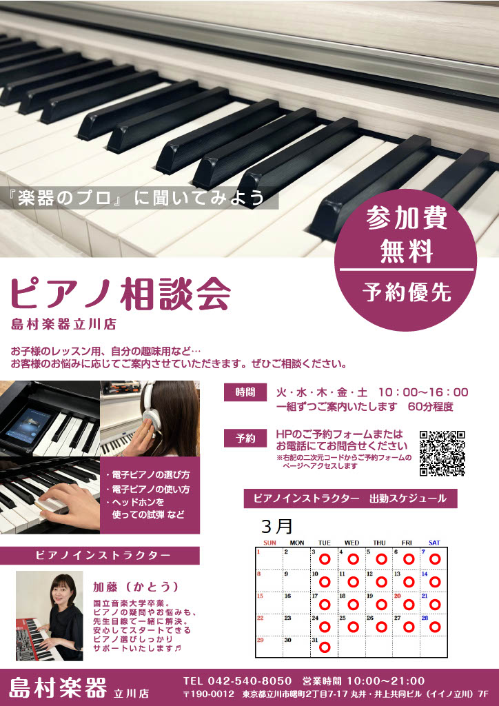 ![こんにちは!ピアノインストラクターの加藤でございます。島村楽器立川店ではピアノインストラクターによる「ピアノ選び相談会」を開催しております!アコースティックピアノ・電子ピアノの選び方や、メーカーごとの音色やタッチ感の違いをご説明しながら、お客様のご要望に最適な機種をご提案させて頂きます。どうぞお気軽 […]](https://www.shimamura.co.jp/shop/tachikawa/wp-content/uploads/sites/194/2024/10/20241101-img_0662.jpg)