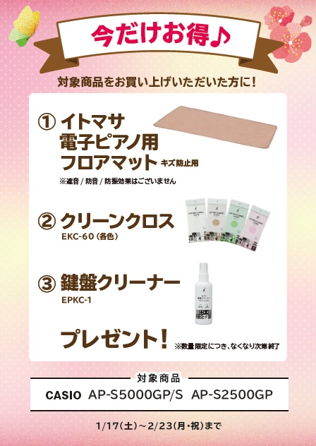 | AP-S5000GP/S | 電子ピアノ用ピアノフロアマット、クリーンクロス、鍵盤クリーナー | ¥181,500 |