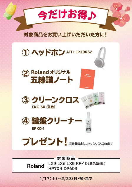 | LX5GP | ヘッドホン『ATH-EP700S2』、 Rolandオリジナル五線譜ノート、 クリーンクロス、 鍵盤クリーナー | ¥266,200 |