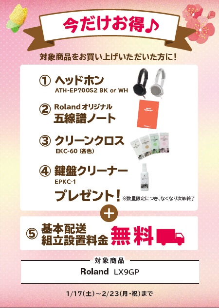 | LX9GP | ヘッドホン『ATH-EP700S2』、 Rolandオリジナル五線譜ノート、 クリーンクロス、 鍵盤クリーナー | ¥460,900 |