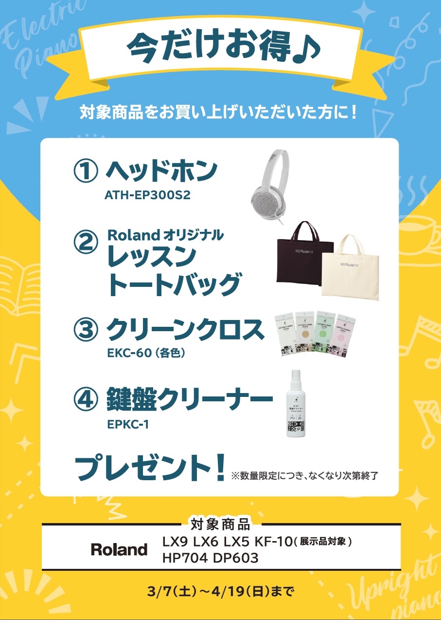 | HP704 | ヘッドホン『ATH-EP300S2』、 Rolandオリジナルレッスントートバック、 クリーンクロス、 鍵盤クリーナー | ¥209,000 |