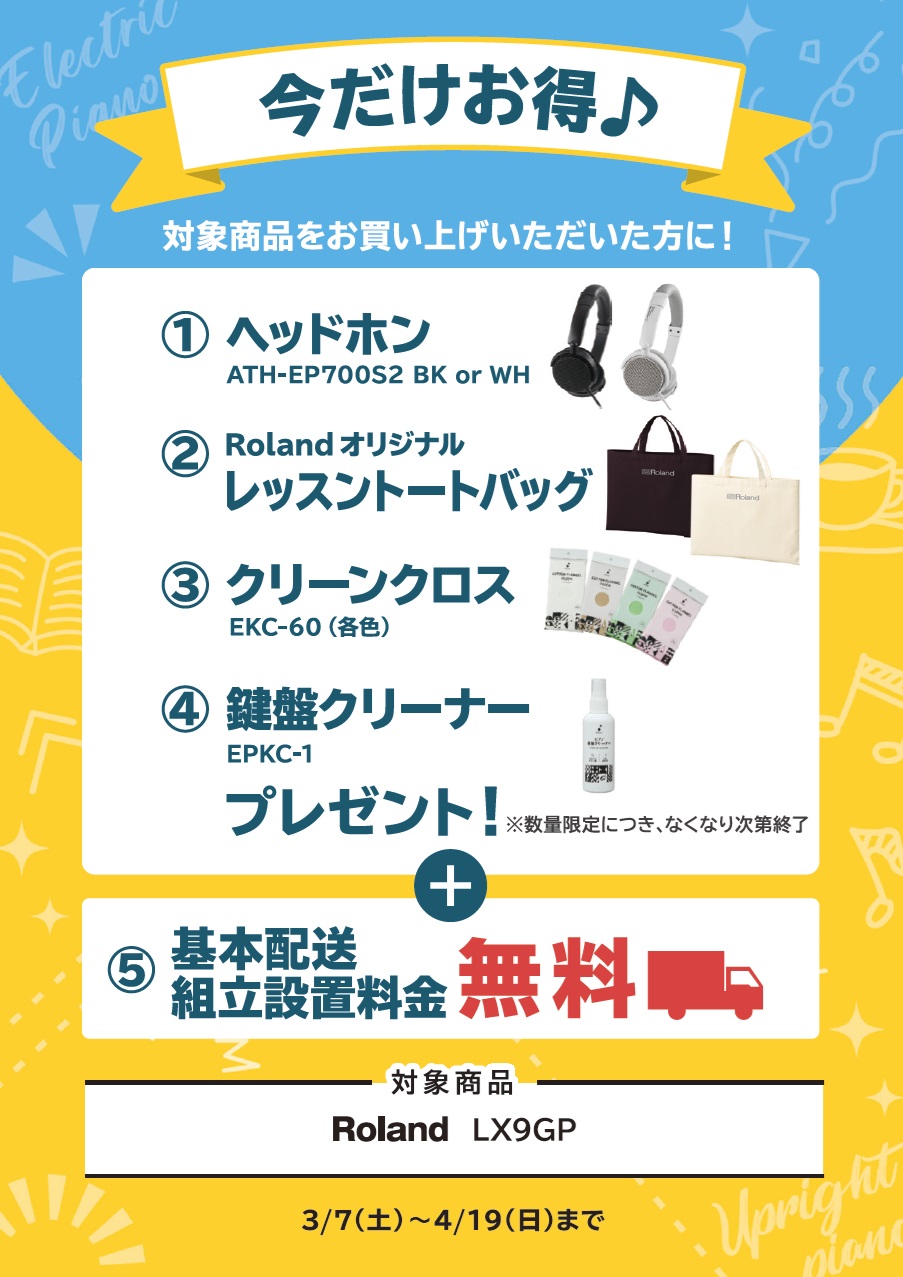 | LX9GP | ヘッドホン『ATH-EP700S2』、 Rolandオリジナルレッスントートバック、 クリーンクロス、 鍵盤クリーナー | ¥460,900 |