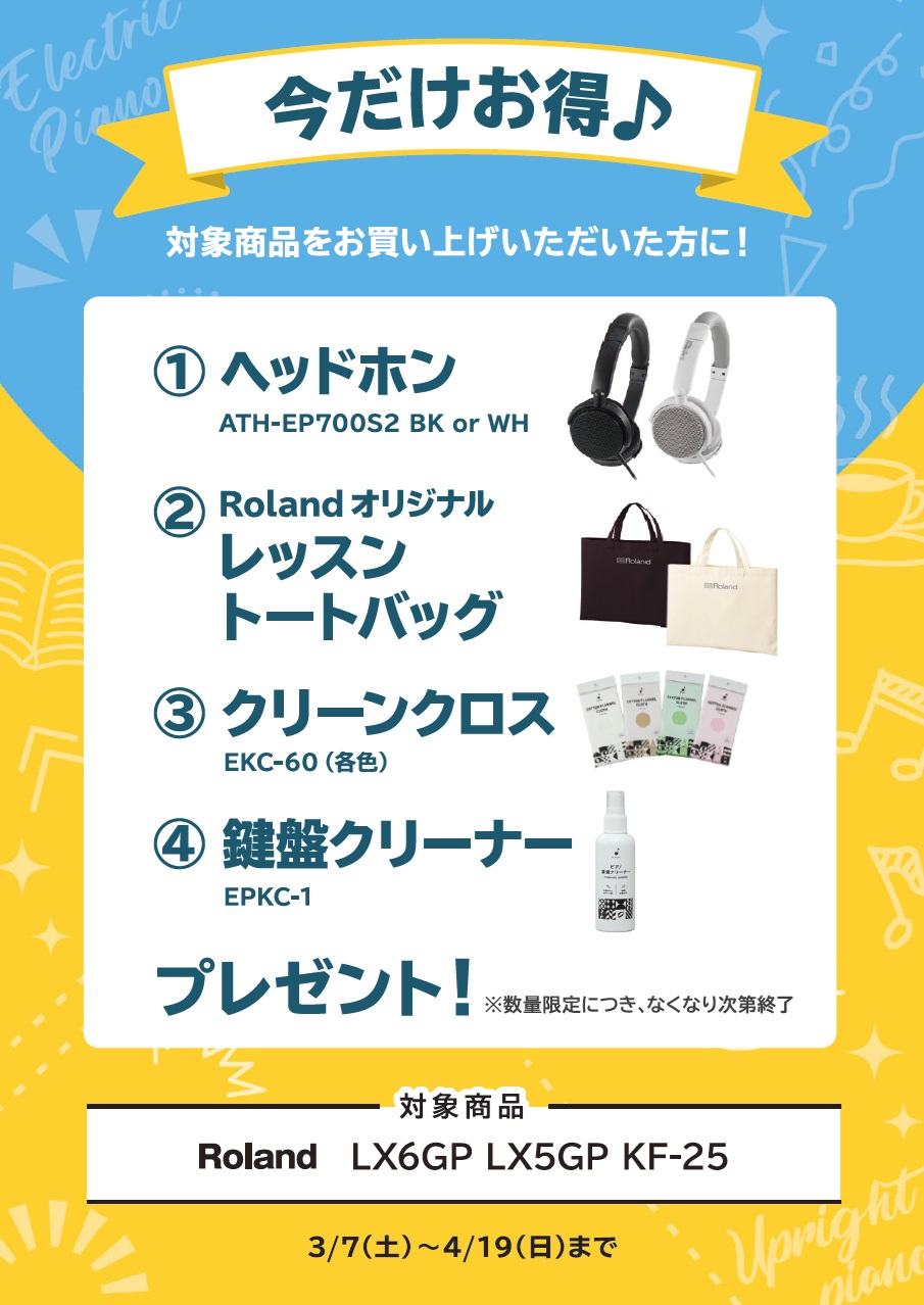 | KF-25 | ヘッドホン『ATH-EP700S2』、 Rolandオリジナルレッスントートバック、 クリーンクロス、 鍵盤クリーナー | ¥495,000 |