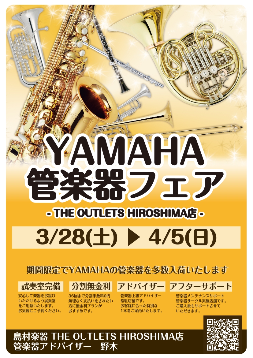 ![アウトレット広島店にて管楽器フェアを実施。管楽器のご購入を検討中のお客様が持つお悩みを管楽器担当者と一緒に解決。また、当店専門スタッフがお客様の楽器選びをサポートいたしますので、この機会に音楽をする楽しさを見つけましょう。 CONTENTSお問い合わせ・ご予約会場のご案内事前予約がおすすめです展示楽 […]](https://www.shimamura.co.jp/shop/theoutlets-hiroshima/wp-content/uploads/sites/183/2026/03/20260321-shima260321-0015.jpg)