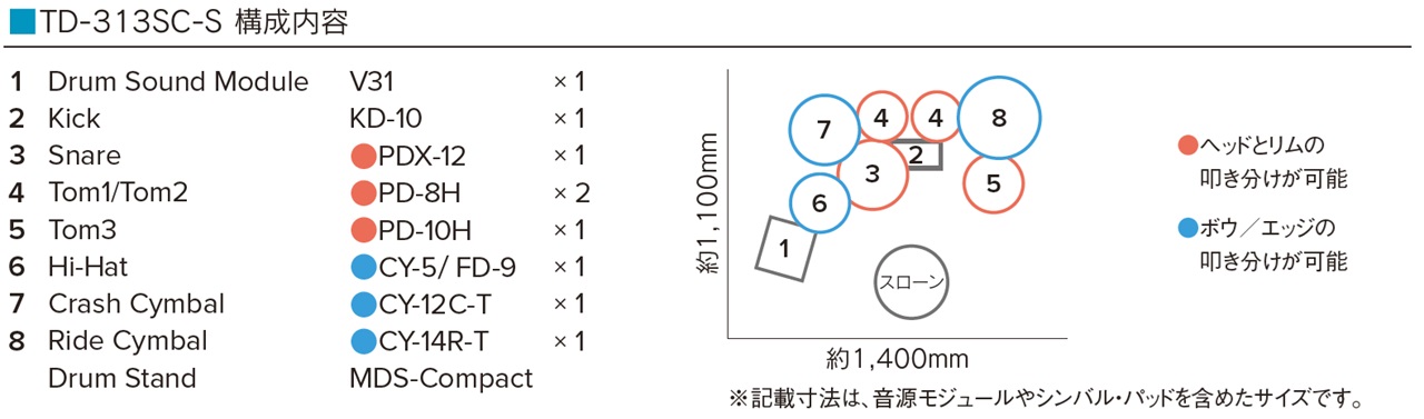 TD313SC-Sは、12インチのスネアや10インチのフロア・タムといった、口径の大きなサイズのパッドを標準搭載しています。