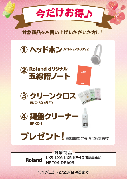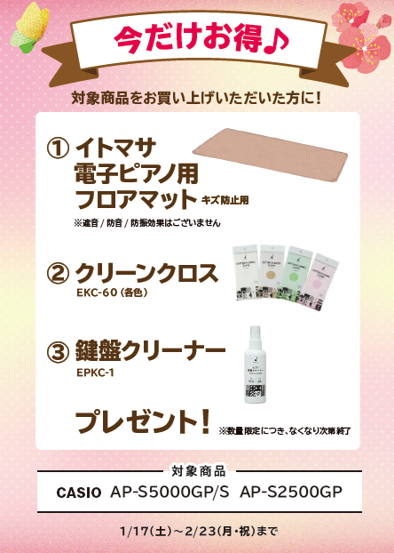 期間中に、対象の電子ピアノをご購入頂くと素敵なプレゼントがございます🎶